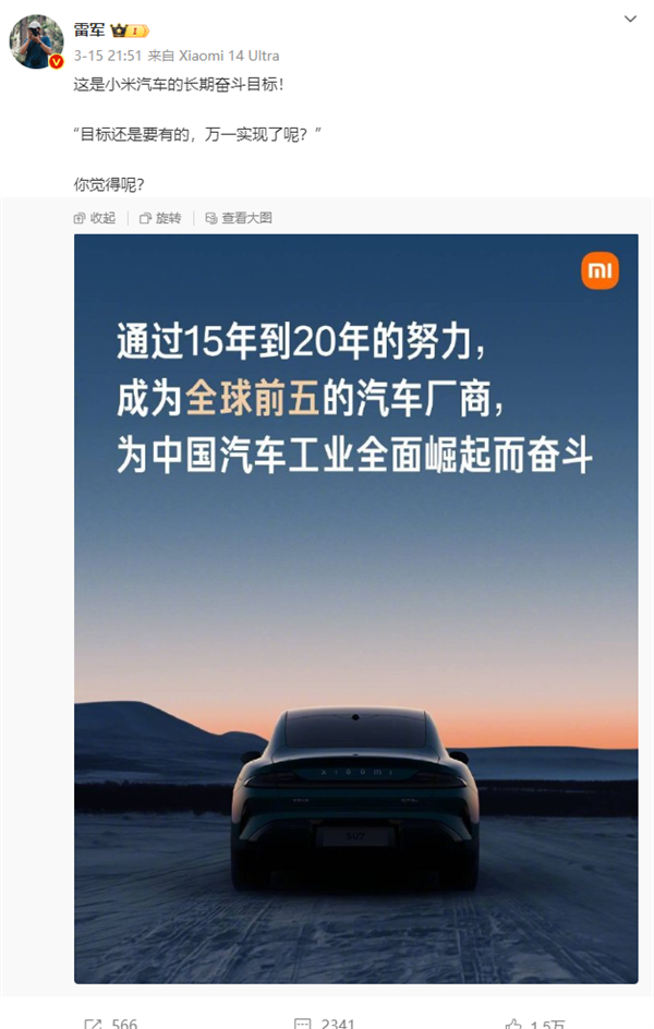 雷軍表示,小米汽車將通過15年到20年的努力,成為全球前五的汽車廠商。