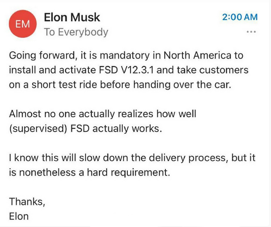 馬斯克在郵件中指出,在交付新車時(shí),必須帶著客戶進(jìn)行一次“短途試駕”,開啟FSD功能,同時(shí),在從服務(wù)中心歸還給客戶時(shí)也要再次帶著客戶體驗(yàn)一次FSD駕駛,以確??蛻羯羁腆w會(huì)到“全自動(dòng)駕駛”功能的好處。