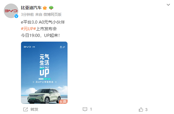 3月26日消息,比亞迪全新純電動SUV元UP將于今晚上市(將全程直播:戳鏈接預(yù)約觀看),其定位于小型車,售價或錨定10萬級。