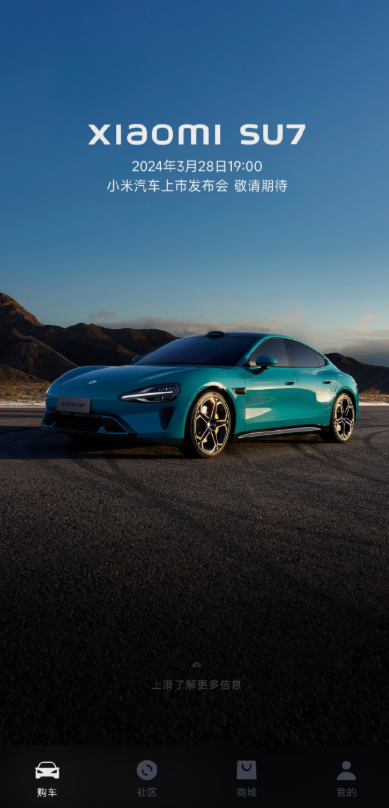 小米汽車App中有購車、社區(qū)、商城以及我的四大板塊,其中,“購車”頁面是對小米SU7進行詳細介紹,“社區(qū)”應(yīng)該就是未來用戶交流的地方。