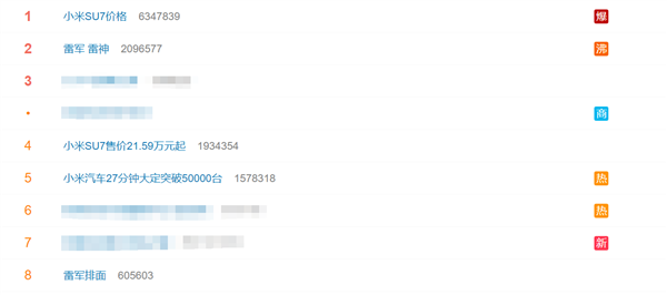 值得一提的是,小米SU7發(fā)布后引發(fā)全網(wǎng)關(guān)注,多個(gè)相關(guān)詞條登上微博熱搜,雷軍也被網(wǎng)友們賦予了“雷神”稱呼。
