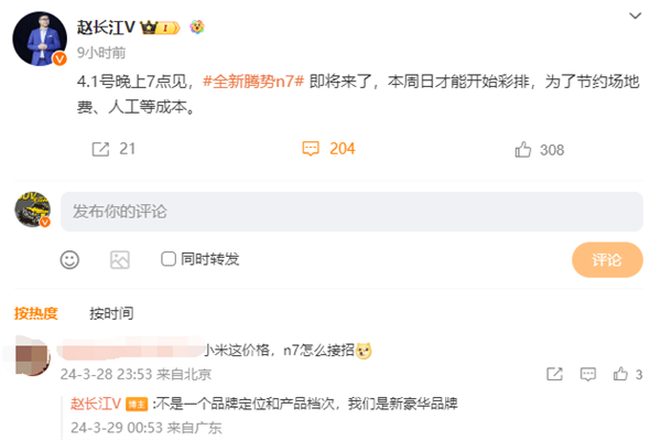 騰勢銷售事業(yè)部總經(jīng)理在回答網(wǎng)友“小米這價格,N7怎么接招”時回應(yīng)稱:不是一個品牌定位和產(chǎn)品檔次,我們是新豪華品牌。