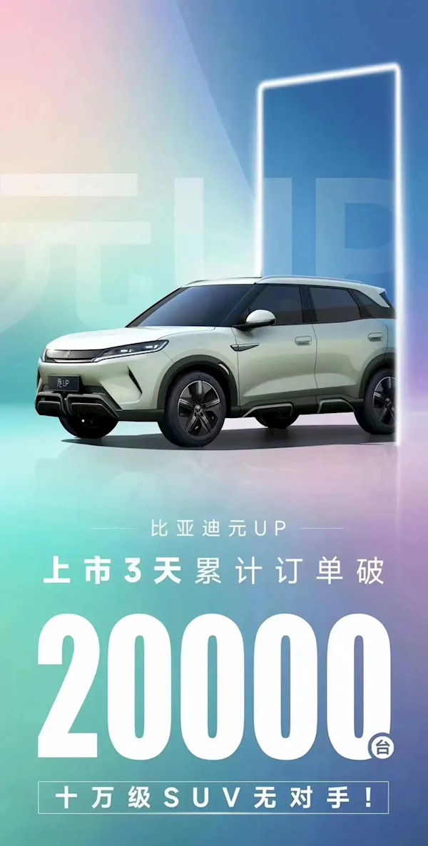 3月29日消息,我們從比亞迪官方獲悉,比亞迪元UP上市3天內訂單已超過2萬臺。