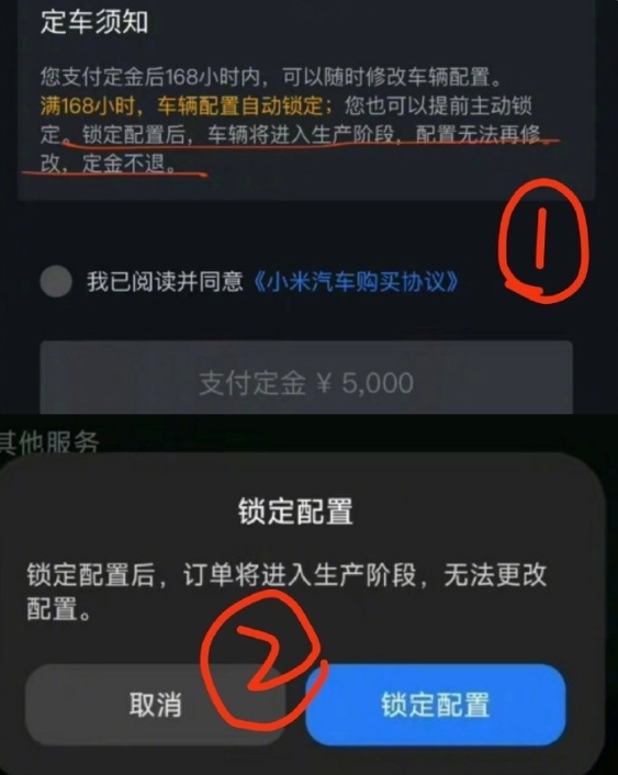 另外,其實(shí)小米相對(duì)傳統(tǒng)車企已經(jīng)寬限了一個(gè)7天的“猶豫期”,支付5000元定金之后如果不進(jìn)行最終的鎖定配置,依然7天內(nèi)可退。