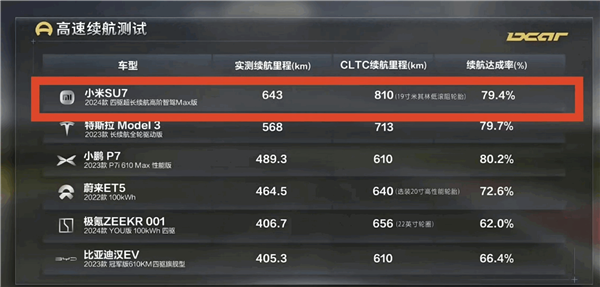 小米SU7Max高速續(xù)航實(shí)測:643km 橫評車型排名第一