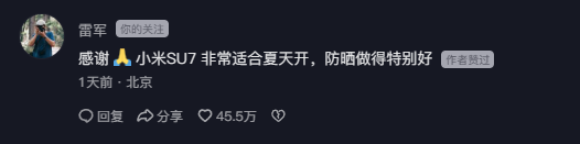令人意外的是,雷軍親自回復(fù):“感謝,小米SU7非常適合夏天開,防曬做得特別好。”