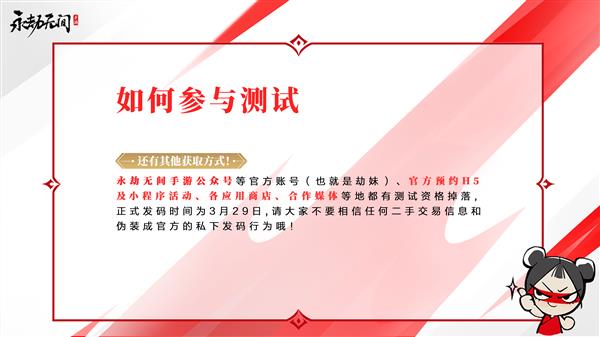 《永劫無間》手游首測(cè)于4月1日正式開啟。玩家通過前往《永劫無間》手游官網(wǎng)預(yù)約并填寫問卷,即有可能獲得測(cè)試資格。同時(shí),官方自媒體、預(yù)約活動(dòng)、游戲論壇、網(wǎng)易大神、各應(yīng)用商店、游戲合作媒體均會(huì)放出少部分測(cè)試資格,測(cè)試資格將于3月29日正式發(fā)放。