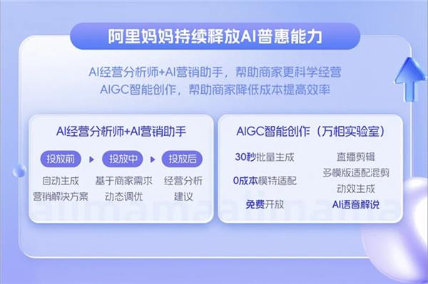 除了運(yùn)營(yíng)扶持,阿里媽媽還將持續(xù)向商家開(kāi)放一系列新的AI工具,比如全新推出的AI經(jīng)營(yíng)分析師、AI營(yíng)銷(xiāo)助手,幫助商家做到實(shí)時(shí)市場(chǎng)波動(dòng)監(jiān)測(cè)、經(jīng)營(yíng)分析建議和自動(dòng)生成營(yíng)銷(xiāo)解決方案等。同時(shí),包括萬(wàn)相實(shí)驗(yàn)室等AIGC智能創(chuàng)作工具免費(fèi)向商家開(kāi)放,幫助商家秒級(jí)批量智能生成圖文、智能剪輯視頻、智能搭建商品頁(yè)面等,讓商家降本增效。