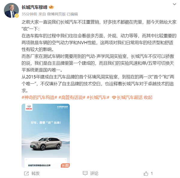 長城汽車總裁:長城自建風洞風速可達300km/h 比12級臺風快近三倍