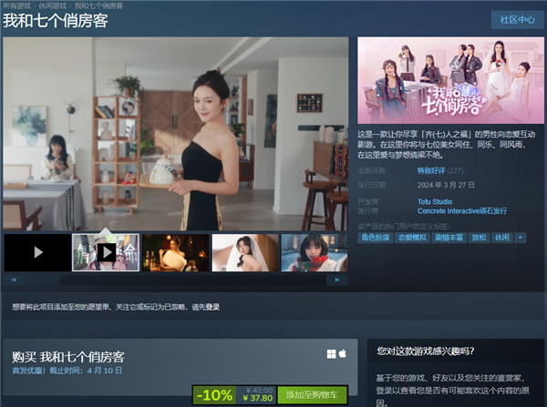 近日真人戀愛互動影游《我和七個俏房客》在Steam上正式發(fā)售,游戲售價42元,首發(fā)優(yōu)惠僅售37.8元。