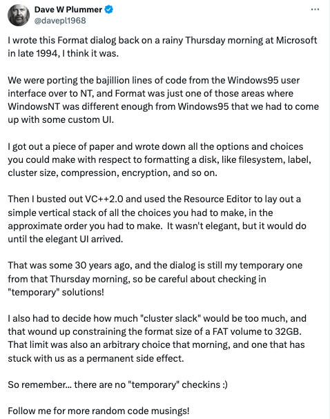曾在微軟工作的程序員Dave Plummer回憶說,Windows格式化界面是他在1994年設(shè)計的,而且只是個臨時設(shè)計,沒想到一直用到了今天。