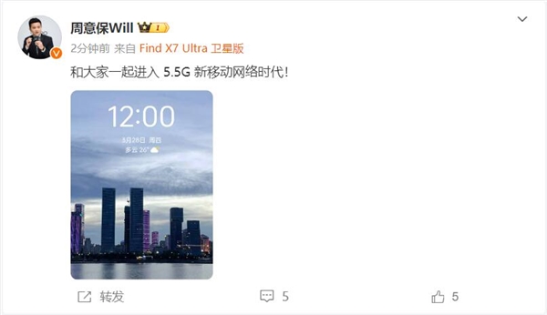 3月28日消息,OPPO周意保分享了OPPO Find X7 Ultra衛(wèi)星通信版的鎖屏截圖,顯示狀態(tài)欄信號(hào)為5.5G(5GA),宣布了5.5G新移動(dòng)網(wǎng)絡(luò)時(shí)代的到來(lái)。
