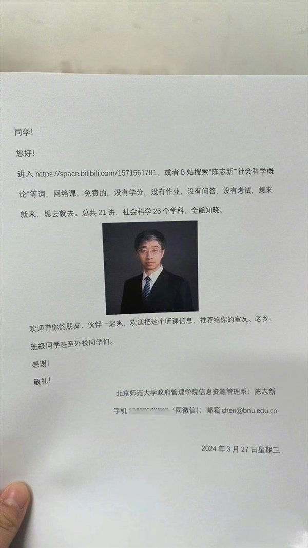 3月28日消息,據(jù)媒體報道,近日,網(wǎng)傳北京師范大學副教授陳志新發(fā)傳單推薦自己一門叫做“社會科學概論”的課程。