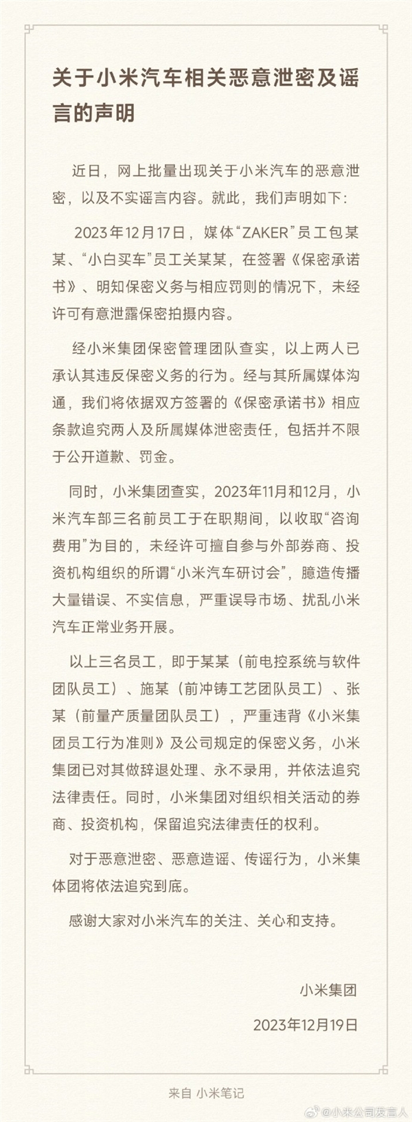 值得注意的是,此前“ZAKER”員工、“小白買車”員工也曾在簽署保密協(xié)議的情況下泄密了小米汽車的相關(guān)內(nèi)容,被官方通報出來。