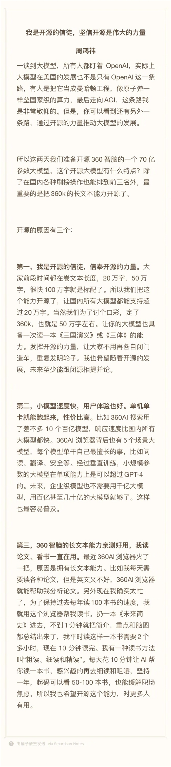 “開源的信徒”周鴻祎宣布將開源360智腦7B模型:支持50萬字長文本輸入