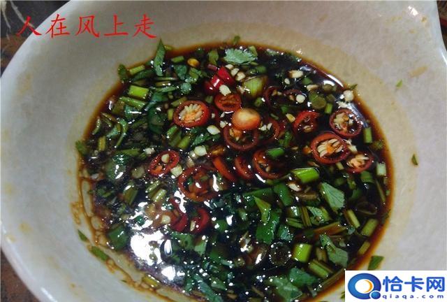 下圖是我之前在餃子館吃餃子時(shí)用耗油、生抽、醋、小米椒、香菜末調(diào)制的蘸料。