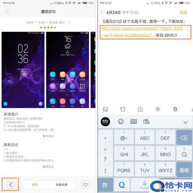 上述方法提取的主題包,會自動增加一些原主題本來沒有的模塊,因此大多數(shù)情況下,暗夜選擇直接下載。同樣在主題商店里找到需要下載的主題,點擊左下角的分享按鈕,隨便分享到QW或者便簽都可以,此操作的目的是獲取主題“網(wǎng)頁地址”。