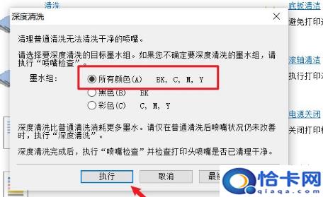 7、選擇【所有顏色】,單擊【執(zhí)行】,即可清洗打印機(jī)噴頭,如下圖所示: