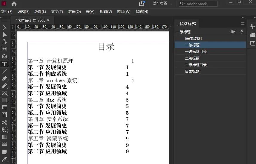 1、在InDesign中新建文檔并導入文本,做目錄之前最主要的就是在文檔標題上應用段落樣式,例如,文章一級標題、二級標題,甚至是三級標題,如圖所示。