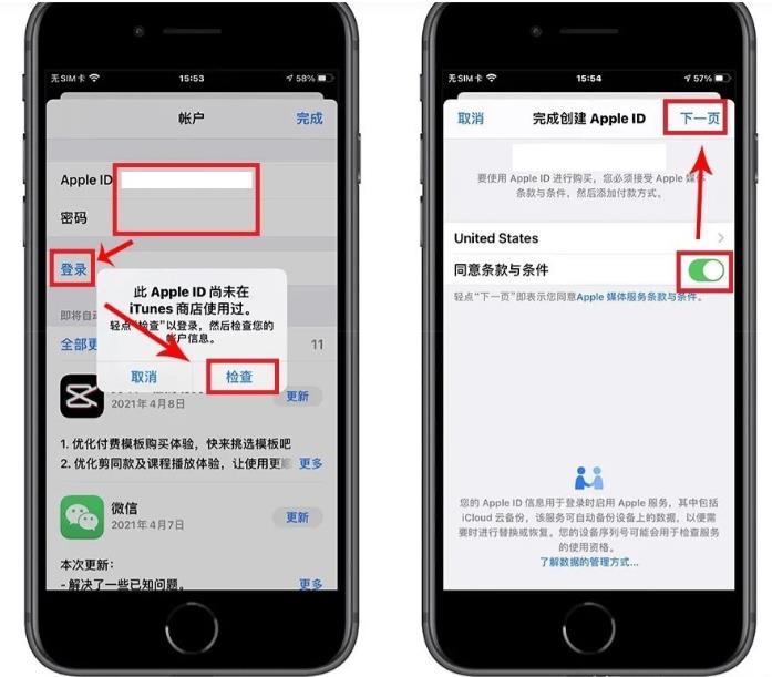 8、打開(kāi) App Store,登陸前面注冊(cè)的賬號(hào)及密碼,會(huì)提示 Apple ID 需要檢查賬戶信息,然后點(diǎn)擊檢查。然后在接下來(lái)的頁(yè)面打開(kāi)同意條款與條件開(kāi)關(guān),點(diǎn)擊下一頁(yè)繼續(xù)。