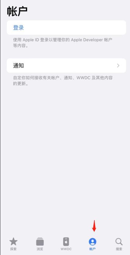 6、下載安裝后打開Apple Developer這個(gè)APP,點(diǎn)擊底部的“賬戶”: