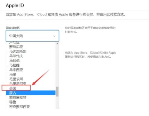 8、在“國家或地區(qū)”中選擇“美國”(當(dāng)然你要注冊其它地區(qū),你就選擇對應(yīng)的地區(qū))。