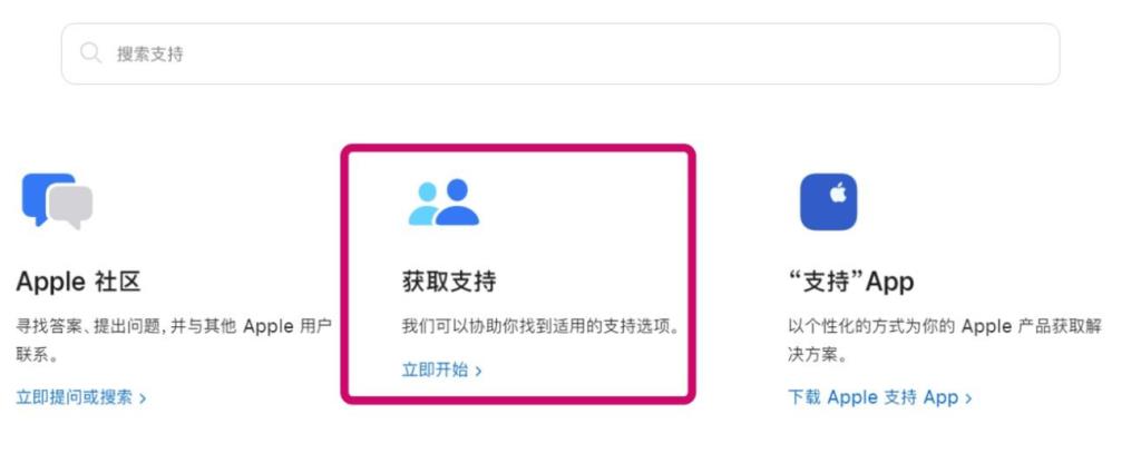 5、在Apple支持的頁面,滑至最下面,然后選擇“獲取支持”下的“立即開始”