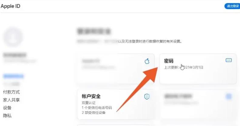 2、打開官網(wǎng)后輸入你的Apple ID和密碼,進(jìn)入ID界面后點(diǎn)擊里面的密碼。