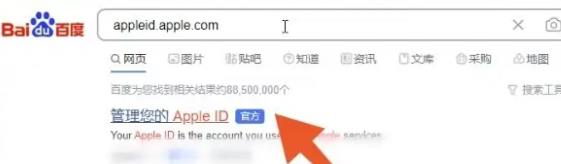 1、進(jìn)入瀏覽器界面后在搜索欄中輸入“appleid.apple.com”進(jìn)行搜索,搜索完成后點(diǎn)擊管理Apple ID的官網(wǎng)。
