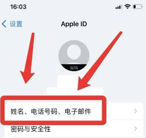 首先打開手機(jī)設(shè)置,進(jìn)入Apple ID頁(yè),打開“姓名、電話號(hào)碼、電子郵件”頁(yè)面。