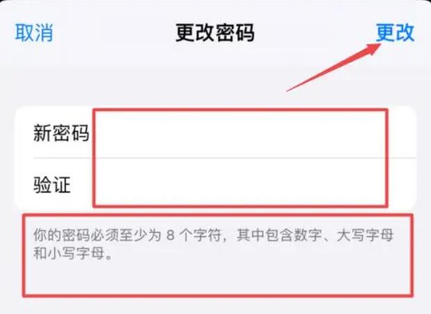 5、根據(jù)密碼要求,在新密碼和驗證中,都輸入同一個要設(shè)置的apple id密碼后,點擊“更改”即可。