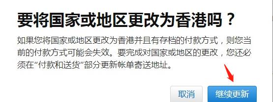 4、選擇香港地區(qū)后,它會彈出“要將國家或地區(qū)更改為香港嗎?”選擇下方的“繼續(xù)更新”。