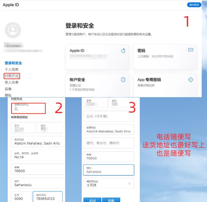 2、進(jìn)入https://appleid.apple.com/account/manage修改地區(qū),付款方式選“無(wú)”,百度搜一個(gè)土耳其地址,比如這個(gè)https://zhidao.baidu.com/question/328653093591517485.html?qbl=relate_question_0,電話隨便寫,送貨地址也最好寫上,也是隨便寫,跟上面完全一樣也沒(méi)關(guān)系,最后點(diǎn)“更新”,之后付款方式那兒不會(huì)直接顯示地址,不用管。