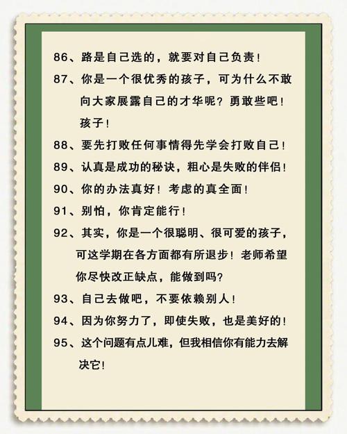 2、增強自信心:老師鼓勵學生,會讓他們感到自己的努力得到了認可,從而增強自信心。這對于孩子的個人發(fā)展和未來的職業(yè)生涯都非常重要。激發(fā)學習興趣:老師的鼓勵可以激發(fā)學生的學習興趣,使他們更愿意投入到學習中去。這對于孩子的知識積累和技能提升都有積極的影響。