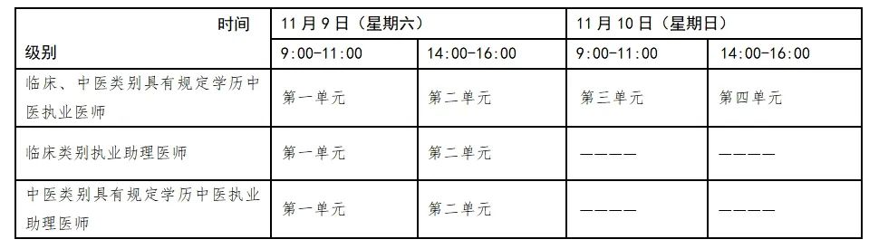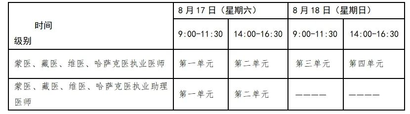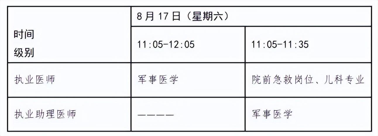 考試實(shí)行計算機(jī)化考試,軍隊現(xiàn)役人員加試軍事醫(yī)學(xué)、院前急救崗位和兒科專業(yè)加試相應(yīng)內(nèi)容。中醫(yī)類別蒙醫(yī)、藏醫(yī)、維醫(yī)、哈薩克醫(yī)專業(yè)實(shí)行紙筆考試。統(tǒng)一考試時間如下: