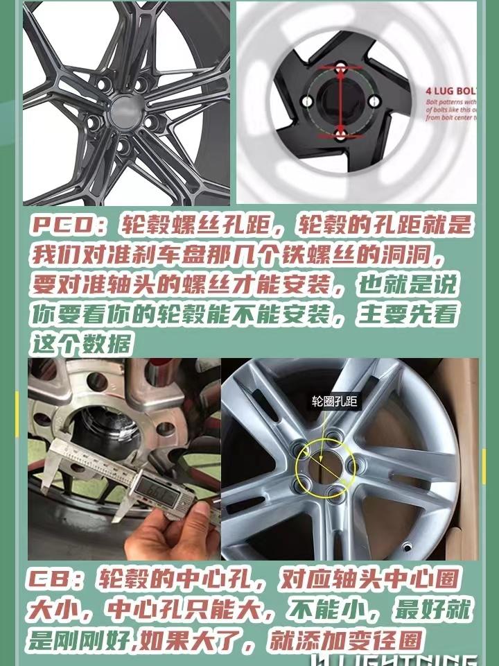 3、節(jié)圓直徑(PCD)& 孔位 ——PCD是輪轂中央的固定螺栓間的直徑。例:4x100、5x120。前者的“4”和“5”代表螺栓孔的數(shù)目;后者的“100”和“120”則代表螺栓孔的節(jié)圓直徑是100mm / 120mm。