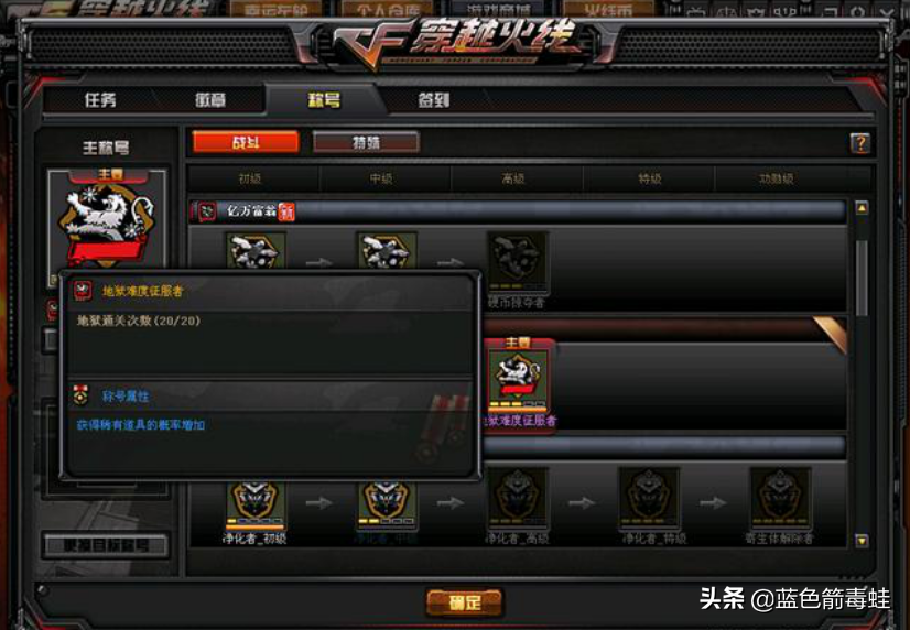 地獄難度征服者這個稱號可在稱號→戰(zhàn)斗中找到,屬性就是獲得稀有道具的概率增加,獲得這個稱號也容易,只要通關(guān)地獄難度的關(guān)卡20次就可以獲得。