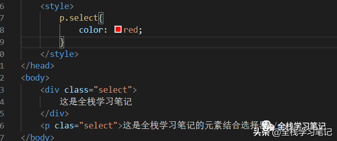 圖中的body標(biāo)簽里面,有一個div,div有一個class屬性,這就是所謂的類,但是這個類不同于java語言的類。然后我們需要對這個div設(shè)置一些樣式,看style里面,.select這個就是類選擇器了,類選擇器需要配合標(biāo)簽的class屬性一起使用。