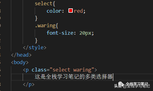 具體是什么意思呢?就是說:本來我的一個select的樣式是夠用的,但是突然加了需求,需要再加一個字體的大小,但是只想P標(biāo)簽使用,并且select又不是一個標(biāo)簽在使用,waring也不是只有一個P標(biāo)簽使用,這時候,多類選擇器就出現(xiàn)了,其實標(biāo)簽的style屬性也可以,但是不推薦這么干。使用多類選擇器之后,這個標(biāo)簽就同時結(jié)合了這兩個選擇器里面的樣式屬性。class里面的類的先后順序沒關(guān)系。
