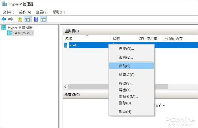 除此之外,你肯定也看到了“檢查點(diǎn)”,它與本機(jī)系統(tǒng)還原點(diǎn)沒(méi)有區(qū)別,軟件自動(dòng)生成,可以在需要時(shí)迅速恢復(fù)正常狀態(tài)。不過(guò)Hyper-V沒(méi)有提供“重啟”按鈕,需要重啟的話只能通過(guò)開(kāi)始菜單了。