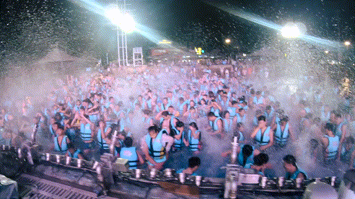 到了正式營業(yè)期間(7.4-8.31),海嘯池晚上開始還會有DJ現(xiàn)場打碟,時不時會搞些電音節(jié),非常high。