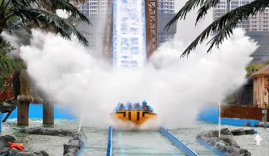 比較刺激的項(xiàng)目就是極度深淵和大海嘯,極度深淵和之前提到的超級大喇叭很像,喇叭口還趴著一只虎視眈眈的大恐龍,大海嘯類似激流勇進(jìn),從高處落下,能激起七八米高的大浪。