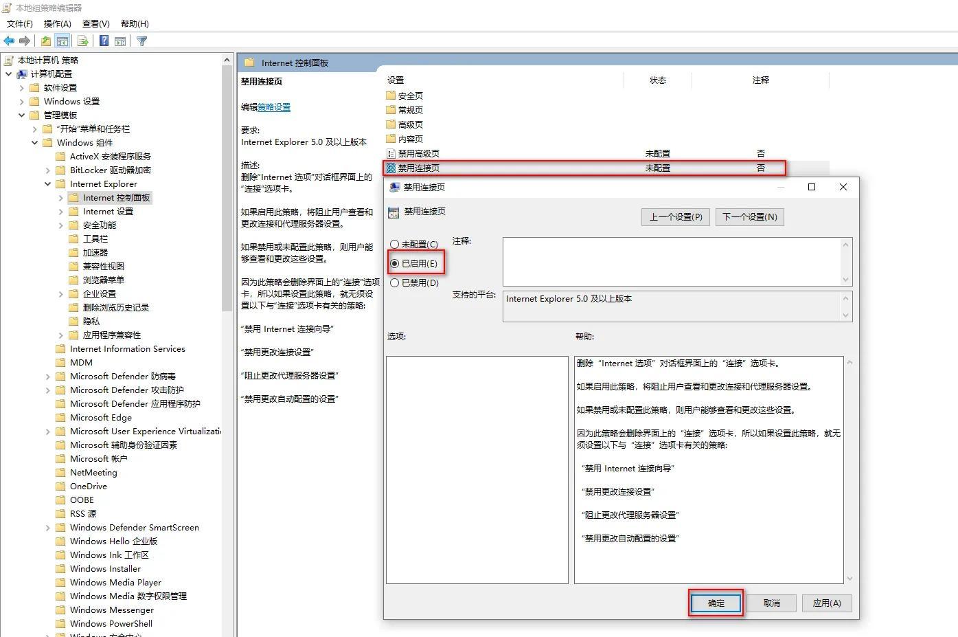 打開本地組策略編輯器后依次找到:計(jì)算機(jī)配置—管理模板—Windows組件—Internet Explorer—Internet控制面板,然后在右側(cè)的窗口內(nèi)找到 禁用連接頁(yè),雙擊打開,默認(rèn)是未配置,我們選擇已啟用選項(xiàng)后點(diǎn)擊確定重啟電腦即可。