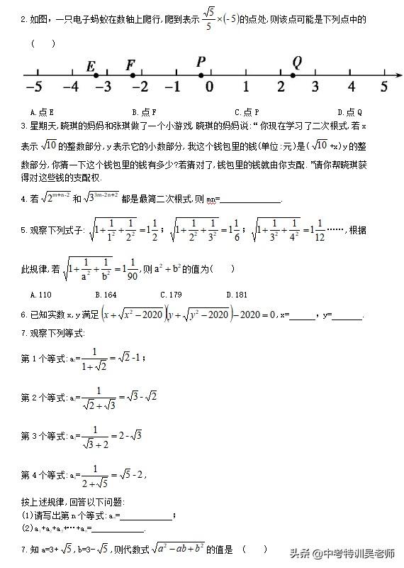 2.如圖,一只電子螞蟻在數(shù)軸上爬行,爬到表示(√5/5)×(-5)的點處,則該點可能是下列點中的?( )