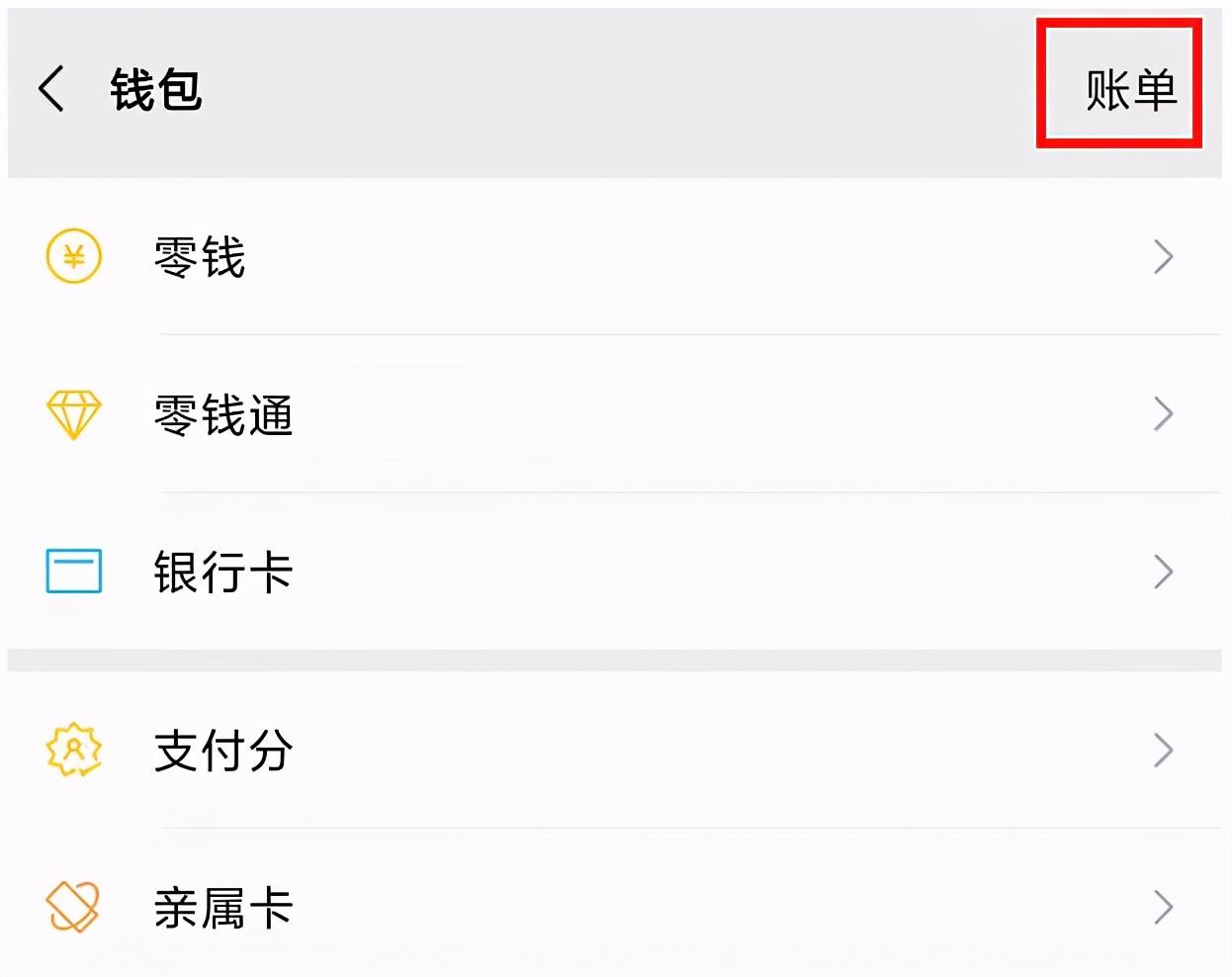 3、在“錢包”界面,點(diǎn)擊右上角“賬單”。
