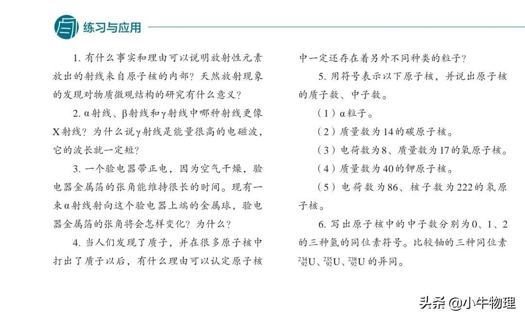 γ射線 是能量很高的電磁波,波長(zhǎng)很短,在10?1?m以下。它的電離作用更弱,穿透能力更強(qiáng),甚至能穿透幾厘米厚的鉛板和幾十厘米厚的混凝土。實(shí)驗(yàn)發(fā)現(xiàn),如果一種元素具有放射性,那么,無論它是以單質(zhì)存在的,還是以化合物形式存在的,都具有放射性。放射性的強(qiáng)度也不受溫度、外界壓強(qiáng)的影響。由于元素的化學(xué)性質(zhì)決定于原子核外的電子,這就說明射線與這些電子無關(guān),也就是說,射線來自原子核。這說明原子核內(nèi)部是有結(jié)構(gòu)的。