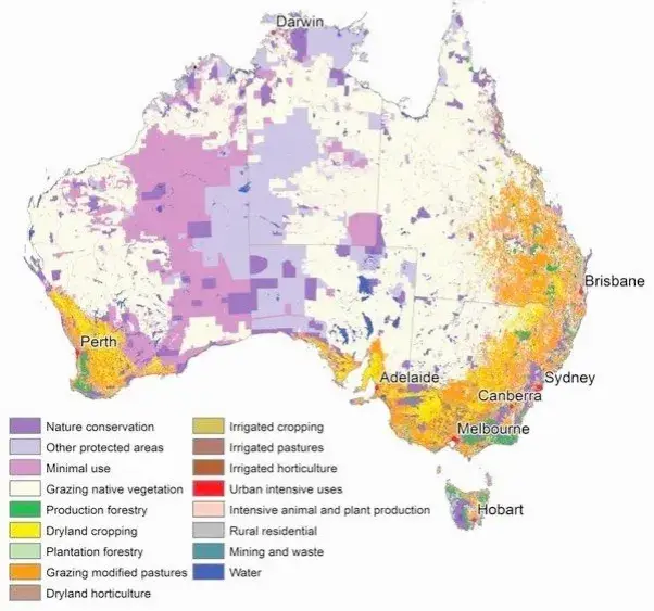 由于干旱少雨,使得澳大利亞適合耕種的面積僅占國(guó)土面積的6%左右,其余區(qū)域則為干旱區(qū)、半干旱區(qū)。