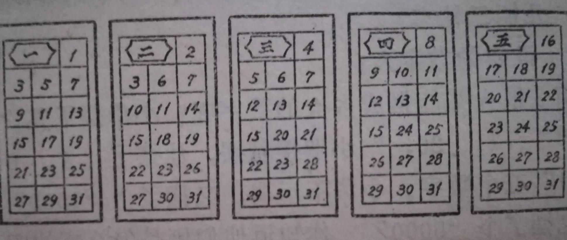 一個(gè)月中間,你最喜歡哪一天?你不用告訴我,只需告訴我在五張卡片(圖)中哪兒張有你所喜歡的日子,我就知道那個(gè)日子。比如,你說(shuō),二、四兩張卡片中有你喜歡的日子,那么你喜歡的是10號(hào),對(duì)不對(duì)?