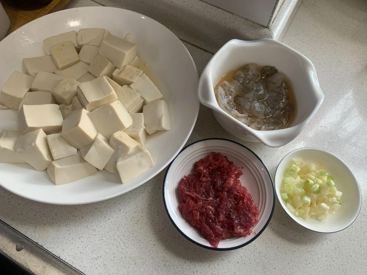 【食材】:嫩豆腐2塊、大蝦4只、牛肉沫適量、蔥姜蒜、蒜苗。