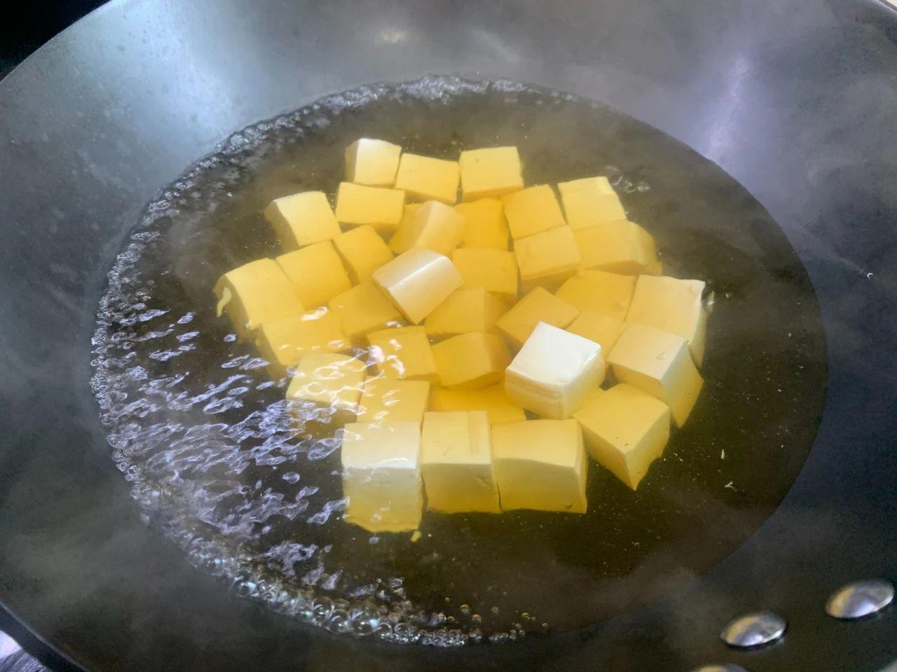 2、鍋中燒開水,加勺鹽和醬油,放入豆腐塊,燒開轉(zhuǎn)小火,煮5分鐘左右。